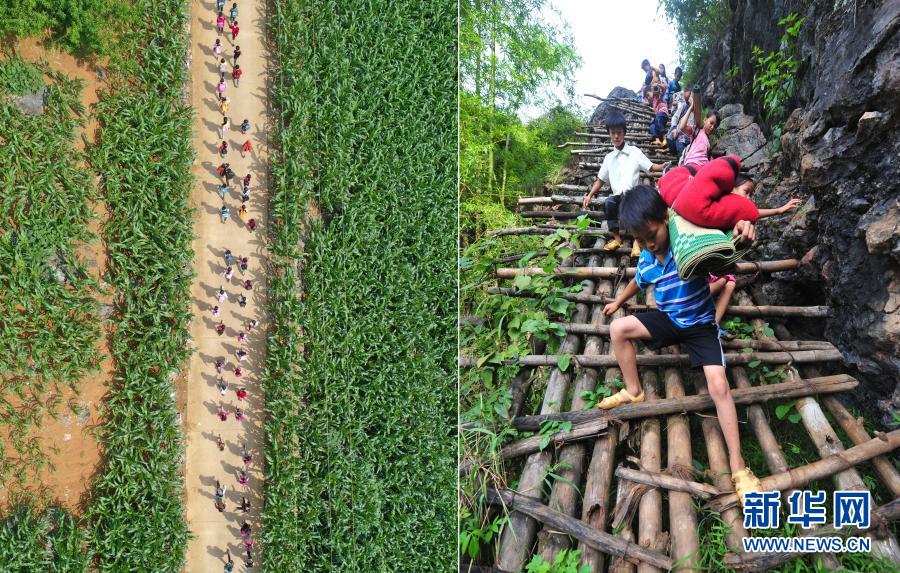 這是一張拼版照片。左圖:在大化瑤族自治縣板升鄉(xiāng)弄勇村,孩子們走在放學路上(2019年5月10日攝,無人機照片);右圖:在弄勇村弄頂屯,孩子們扛著生活用具,爬懸梯上學(2012年9月3日攝)。目前,弄勇村所有的屯都已告別沒有公路的歷史。新華社記者 黃孝邦 攝