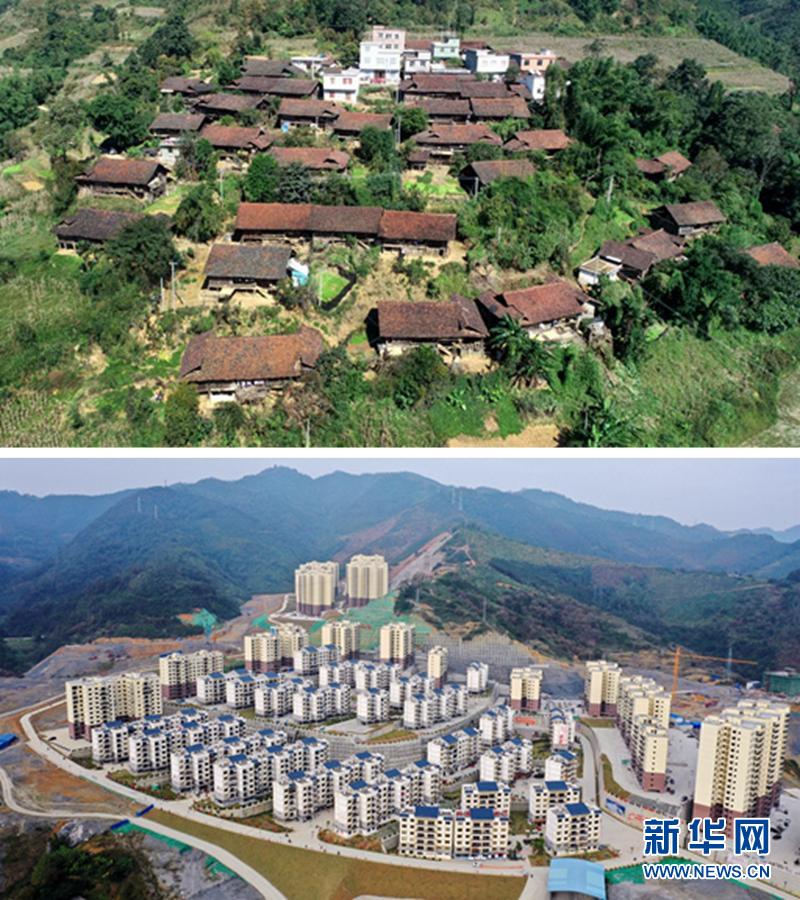 這是一張拼版照片。上圖:整屯搬遷前的廣西南丹縣里湖瑤族鄉(xiāng)董甲村么干屯(2018年1月10日攝)。這里的村民都搬遷到“千家瑤寨·萬戶瑤鄉(xiāng)”里湖王尚易地扶貧搬遷安置點。下圖:“千家瑤寨·萬戶瑤鄉(xiāng)”里湖王尚易地扶貧搬遷安置點(8月4日攝,無人機照片)。新華社記者 周華 攝