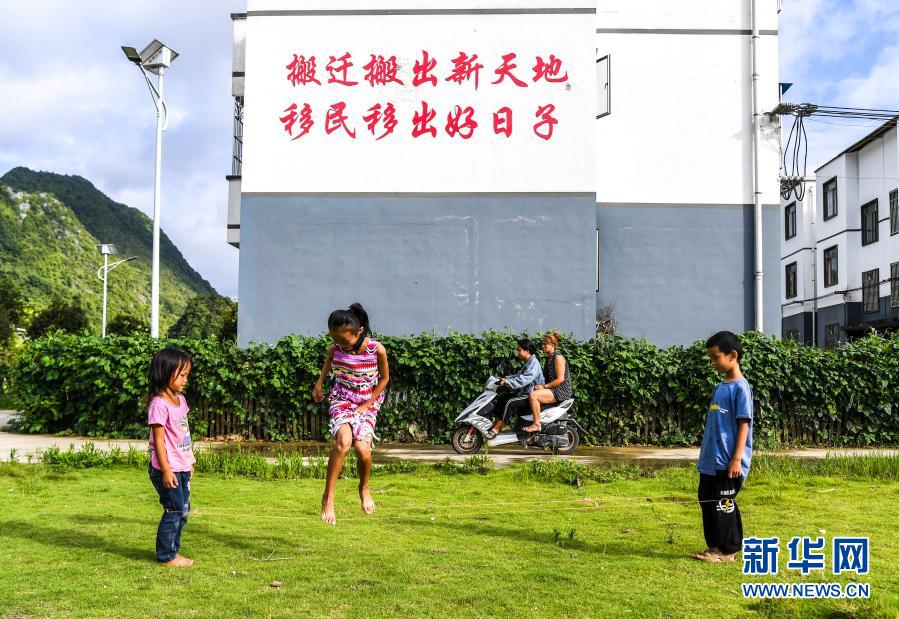 在廣西都安瑤族自治縣下坳鎮(zhèn)車家莊易地扶貧搬遷安置新區(qū),小朋友在玩耍(8月18日攝)。新華社記者 周華 攝