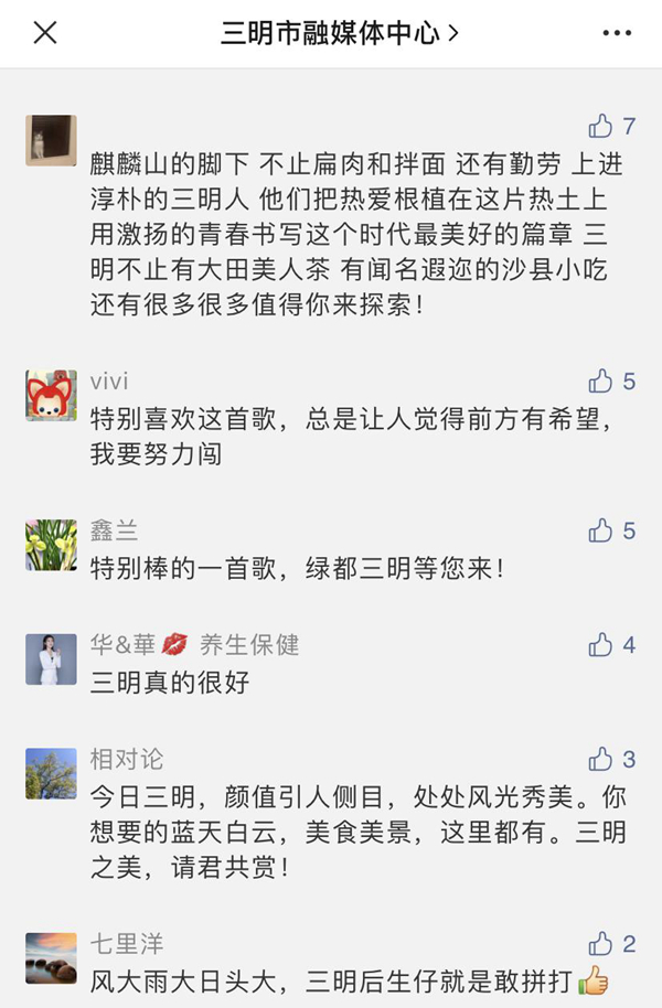 “我大福建真是處處美得沒話說!”“哈哈,我大沙縣又壓軸了。”“太好聽了!內心充滿自豪!”“開門見綠,抬頭見藍,這就是我的家鄉(xiāng)。”還有網友希望這首歌“能上春晚”。更有網友吟誦起三明,“好山好水好風情,數一數二數三明。紅軍長征出發(fā)地,客家文化傳世界 …… ”