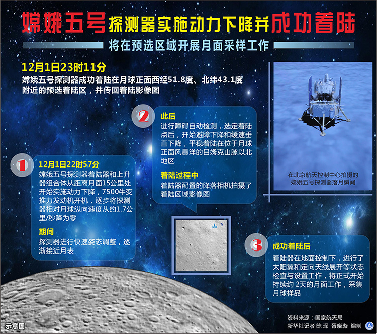 圖表:嫦娥五號(hào)探測(cè)器實(shí)施動(dòng)力下降并成功著陸 將在預(yù)選區(qū)域開展月面采樣工作 新華社記者 陳琛 編制