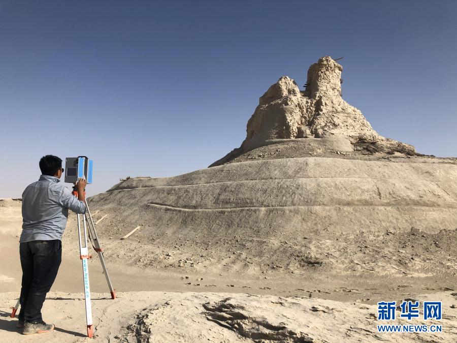技術(shù)專家在樓蘭古城內(nèi)使用三維激光掃描技術(shù)為佛塔遺址建立數(shù)字化檔案(10月20日攝)。新華社發(fā)