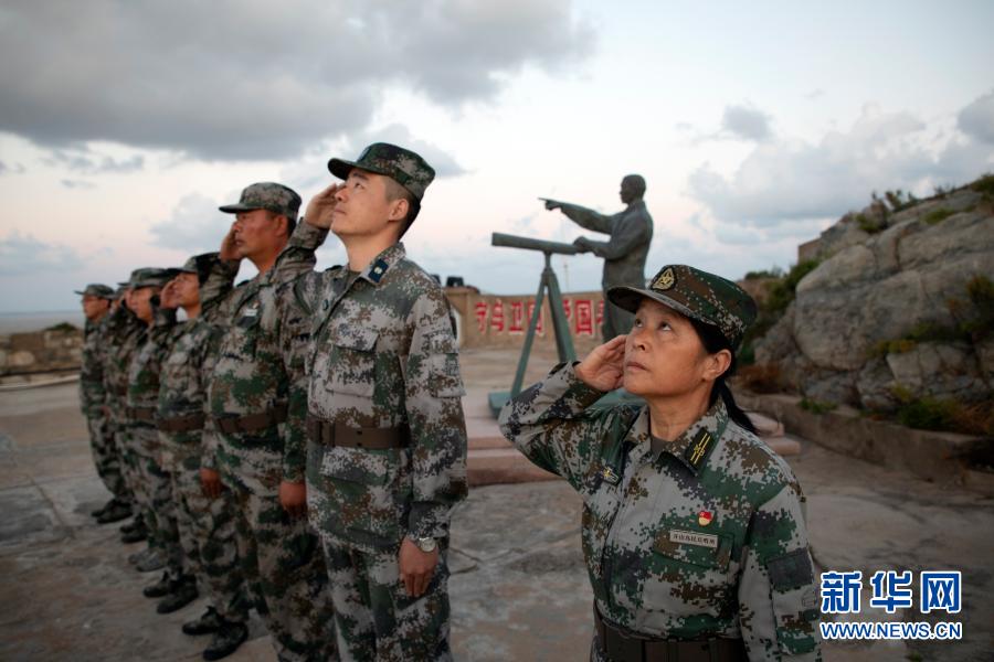 在江蘇省灌云縣開(kāi)山島,王仕花(右一)和輪值民兵一起向國(guó)旗敬禮(9月27日攝)。新華社記者 劉芳 攝
