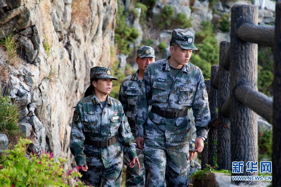 在江蘇省灌云縣開(kāi)山島,王仕花(左)、民兵哨所所長(zhǎng)陳志顯(右)和輪值民兵一起巡邏(9月27日攝)。新華社記者 劉芳 攝