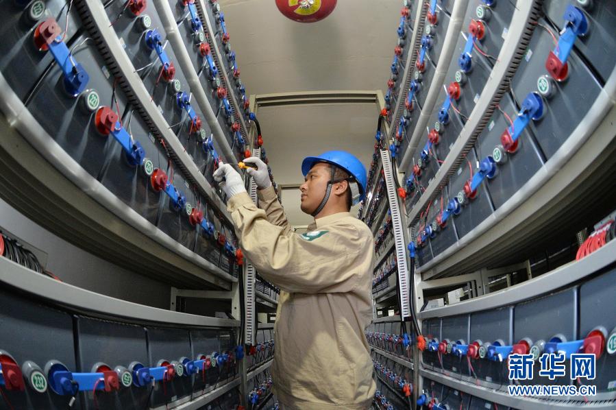 在江蘇省灌云縣開(kāi)山島,國(guó)家電網(wǎng)的施工人員在調(diào)試“風(fēng)光儲(chǔ)互補(bǔ)智能微電網(wǎng)系統(tǒng)”的蓄電池組(2019年6月18日攝)。新華社發(fā)(萬(wàn)程鵬 攝)