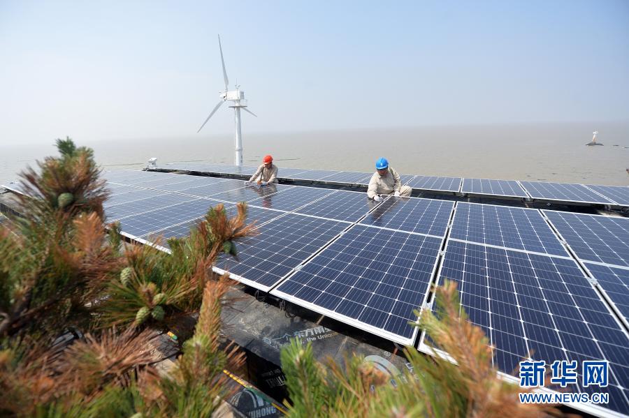 在江蘇省灌云縣開(kāi)山島,國(guó)家電網(wǎng)的施工人員在屋頂上檢查光伏面板運(yùn)行情況(2019年6月18日攝)。新華社發(fā)(萬(wàn)程鵬 攝)