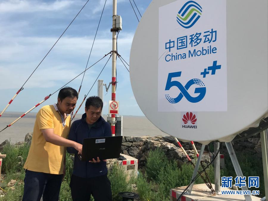 在江蘇省灌云縣開(kāi)山島,中國(guó)移動(dòng)工作人員測(cè)試5G信號(hào)(5月20日攝)。新華社發(fā)(茆平平 攝)