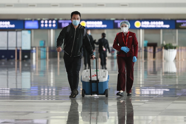 ▲ 2020年4月24日,武漢協(xié)和醫(yī)院心外科醫(yī)生盧雄豪(左)運送來自山東的供肺抵達武漢天河機場。疫情期間原定航班取消,移植團隊與中國國際航空公司聯(lián)系后,該公司緊急啟動綠色通道,重新開通此航班。新華社記者 沈伯韓攝
