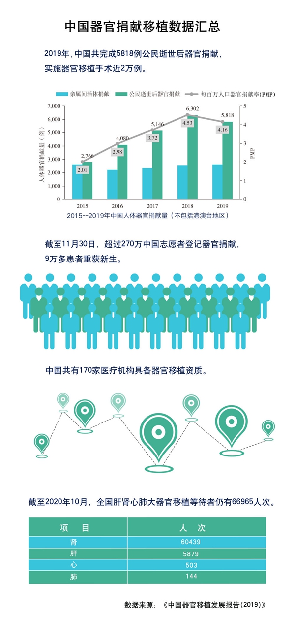 ——進一步拓寬器官捐獻來源滿足移植需求?!爸袊鞴倬璜I數(shù)量和捐獻率雖逐年增長,但與國內患者的巨大需求相比相距甚遠?!蓖鹾2ㄕf,截至2020年10月,全國仍有60439人次等待腎移植、5879人次等待肝移植、503人次等待心移植、144人次等待肺移植。
