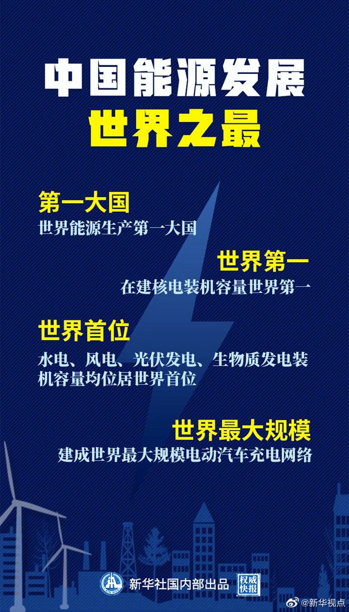 根據(jù)國(guó)務(wù)院新聞辦公室21日發(fā)布的《新時(shí)代的中國(guó)能源發(fā)展》白皮書(shū),中國(guó)能源發(fā)展有多個(gè)世界之最:初步核算,2019年中國(guó)一次能源生產(chǎn)總量達(dá)39.7億噸標(biāo)準(zhǔn)煤,為世界能源生產(chǎn)第一大國(guó);截至2019年底,在運(yùn)在建核電裝機(jī)容量6593萬(wàn)千瓦,居世界第二,在建核電裝機(jī)容量世界第一;截至2019年底,水電、風(fēng)電、光伏發(fā)電、生物質(zhì)發(fā)電裝機(jī)容量分別達(dá)3.56億千瓦、2.1億千瓦、2.04億千瓦、2369萬(wàn)千瓦,均位居世界首位;截至2019年底,全國(guó)電動(dòng)汽車充電基礎(chǔ)設(shè)施達(dá)120萬(wàn)處,建成世界最大規(guī)模充電網(wǎng)絡(luò)。(記者:劉羊旸 海報(bào)設(shè)計(jì):張晨光)