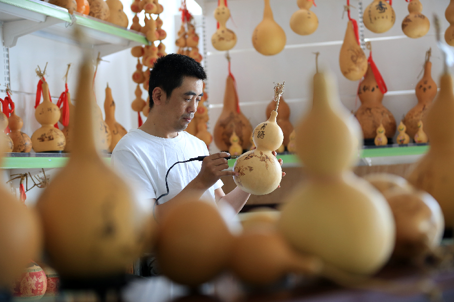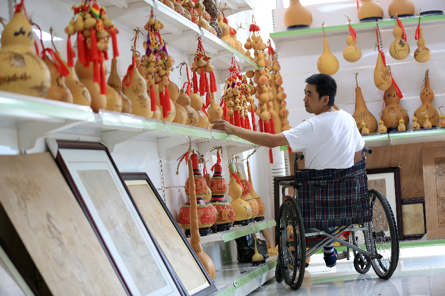 ????河北省邢臺(tái)市平鄉(xiāng)縣霍建龍,2014年因一起意外事故導(dǎo)致高位截癱。身殘志堅(jiān)的他學(xué)習(xí)烙畫(huà)葫蘆藝術(shù),實(shí)現(xiàn)脫貧致富,并創(chuàng)辦了殘疾人烙畫(huà)葫蘆社,帶領(lǐng)其他殘疾貧困群眾脫貧致富。圖為霍建龍整理葫蘆作品。 柴更利 攝
