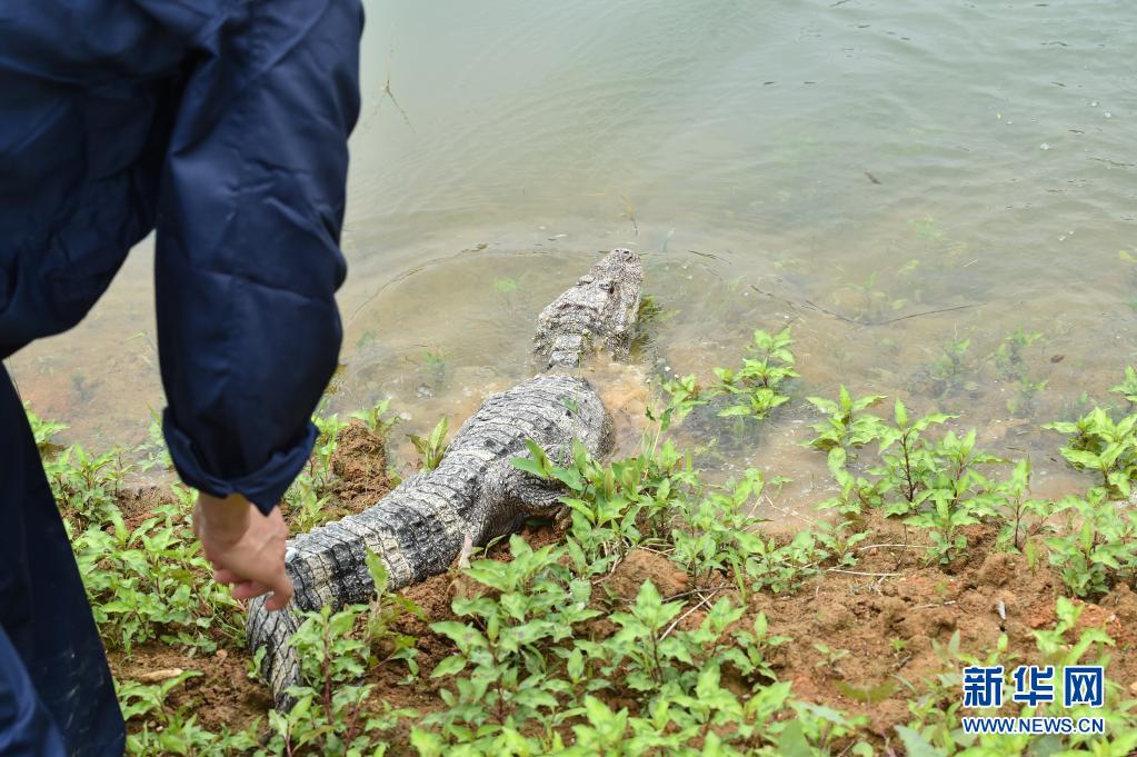 5月13日,工作人員放歸揚(yáng)子鱷。當(dāng)日,安徽揚(yáng)子鱷國家級自然保護(hù)區(qū)在涇縣雙坑片區(qū)揚(yáng)子鱷核心棲息地放歸51條人工繁育揚(yáng)子鱷?!⌒氯A社記者 韓旭 攝