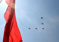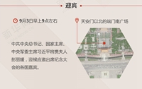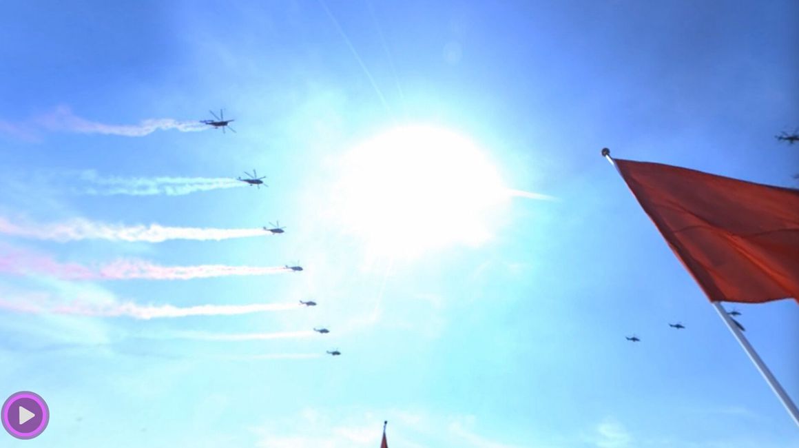 蔚藍(lán)的天空中,6架直升機(jī)護(hù)衛(wèi)著國旗和軍旗、20架直升機(jī)飛成“70”字樣、7架教練機(jī)拉出7道彩煙——率先從天安門廣場飛過的空中護(hù)旗方隊(duì),揭開了勝利日大閱兵的序幕。9月3日,雄偉的天安門,寬闊的長安街,見證著這場大閱兵的一個又一個精彩瞬間。