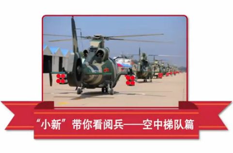 方隊(duì)由26架直升機(jī)和7架教練機(jī)組成。國旗和軍旗分別由1架直升機(jī)在正下方懸掛、由2架直升機(jī)護(hù)衛(wèi),組成兩組三機(jī)梯隊(duì),呈品字形依次通過。緊隨其后的是由20架直升機(jī)組成“70”字樣,寓意中華民族以抗戰(zhàn)勝利為起點(diǎn)走向偉大復(fù)興的征程。這是我國在閱兵中首次采用紀(jì)念數(shù)字的編隊(duì)飛行。