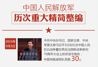 中共中央總書記、國家主席、中央軍委主席習(xí)近平3日在紀(jì)念中國人民抗日戰(zhàn)爭暨世界反法西斯戰(zhàn)爭勝利70周年大會上的講話中宣布:中國將裁減軍隊(duì)員額30萬。