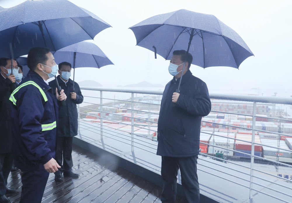 當(dāng)時,總書記從辦公樓里走到室外平臺俯瞰穿山港區(qū),隨后又回到了室內(nèi),所以這個過程中一直佩戴著口罩?!?