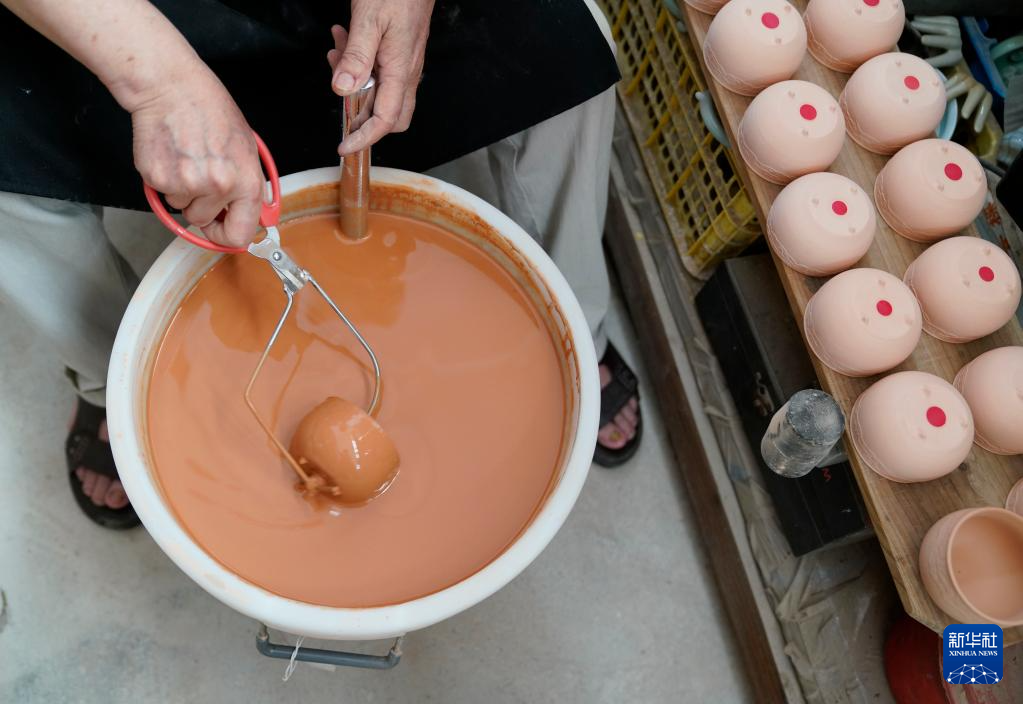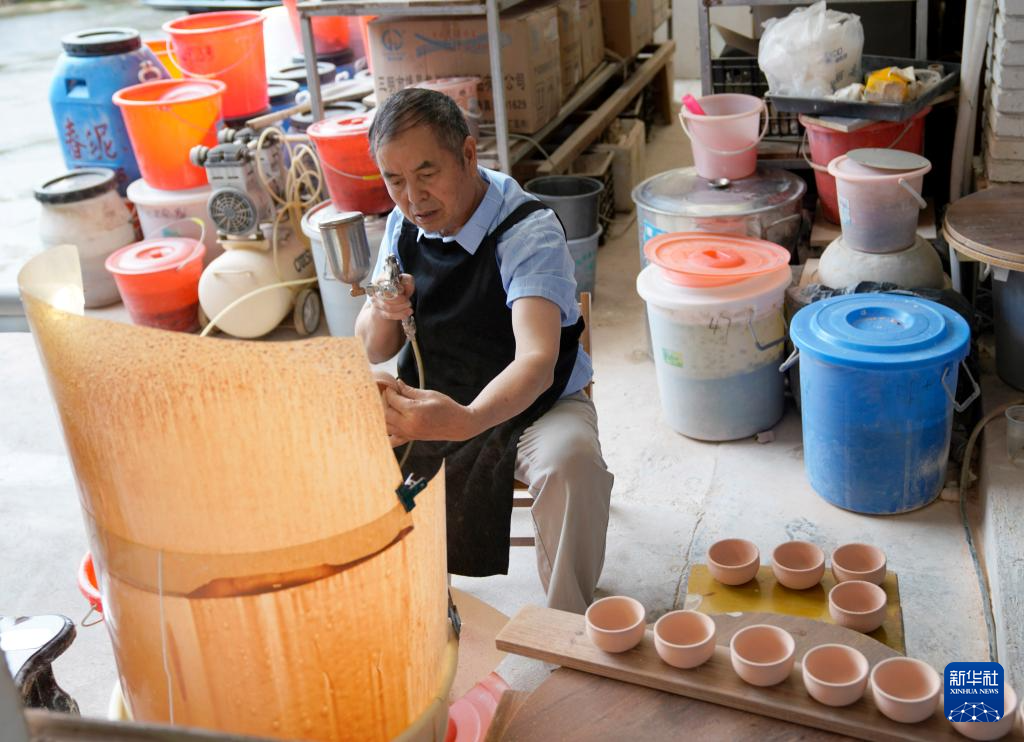6月7日,刘法星在松阳县家中的工作室内为瓷器素胎上釉。