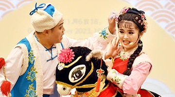 11月9日,在开化纸传统技艺工坊,黄宏健(中)和妻子赖丽芳(左)向来访者展示各类纸品。