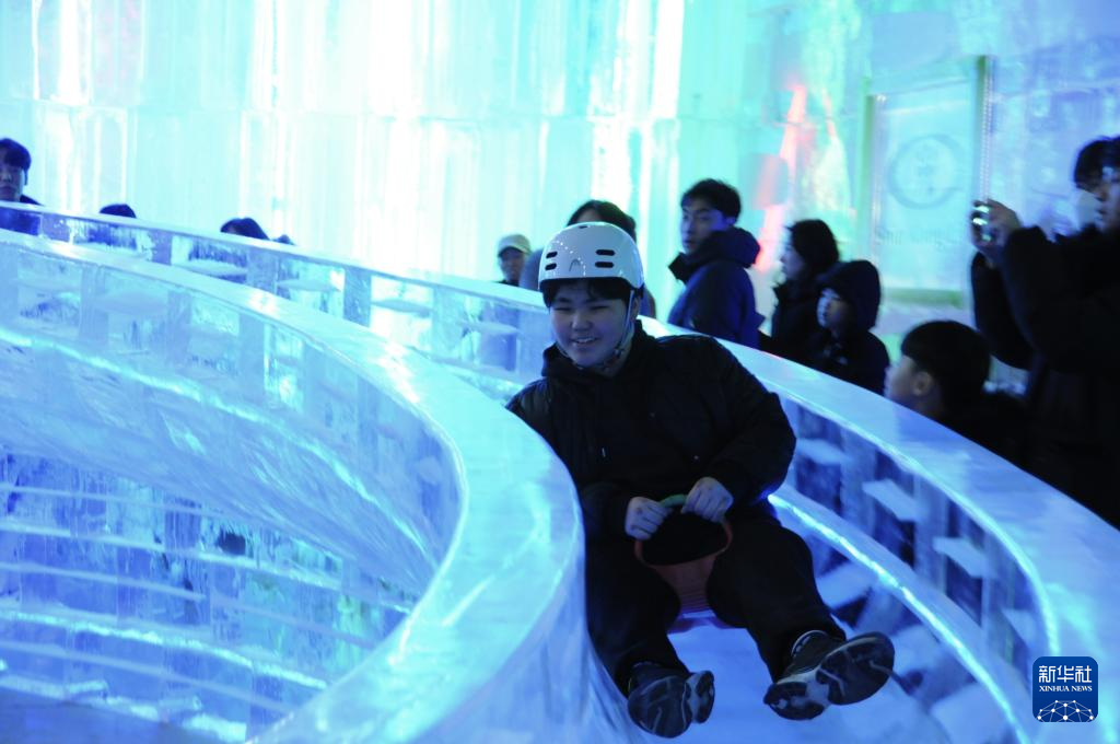 1月13日,在韩国江原道的华川山鳟鱼节现场,游客体验哈尔滨工匠制作的冰滑梯。