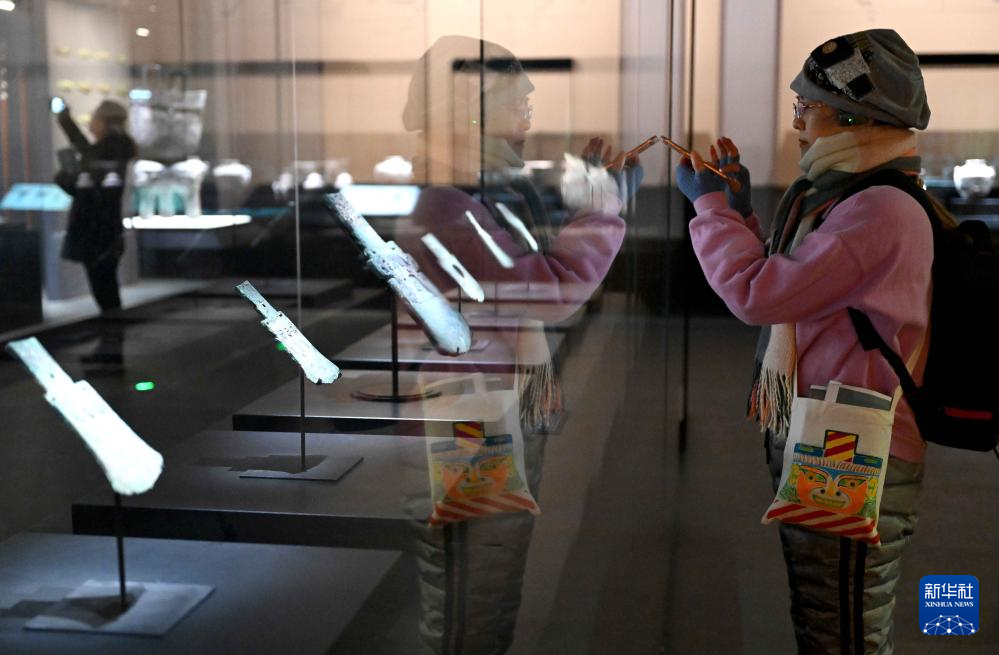 2月26日,参观者在河南安阳殷墟博物馆新馆内观看展品。