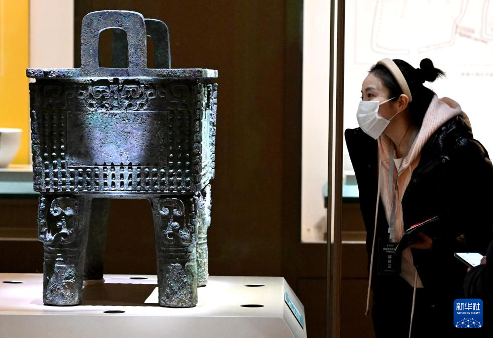 2月26日,参观者在河南安阳殷墟博物馆新馆内观看“亚长”铜方斝。