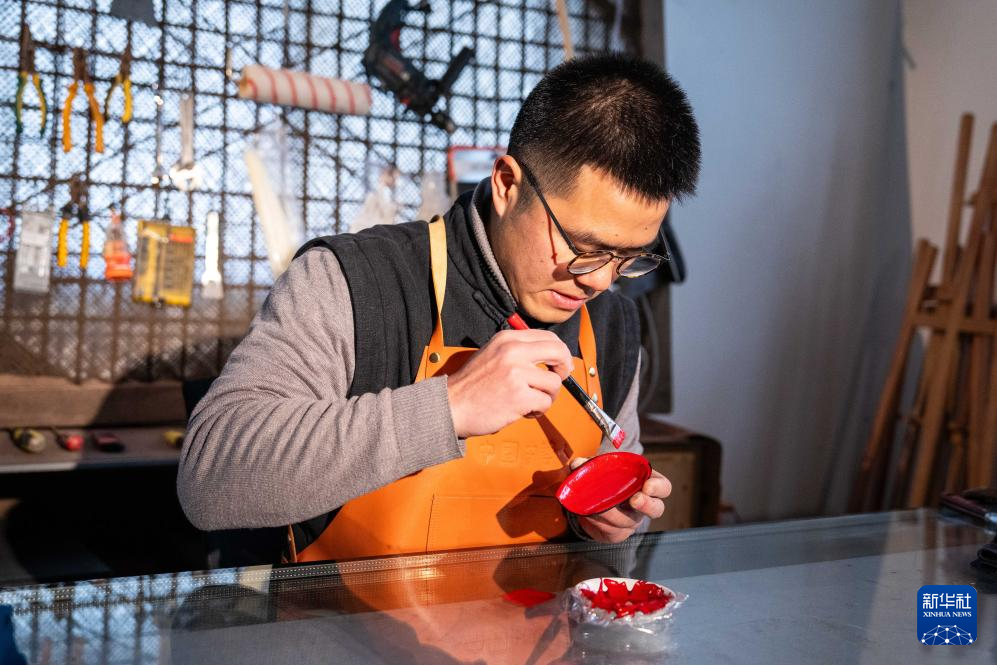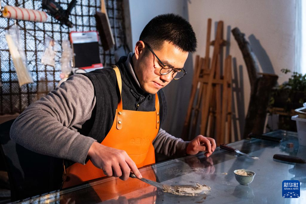 2月28日,郝冠雄在擦漆,为的是让大漆充分渗透到木胎里。