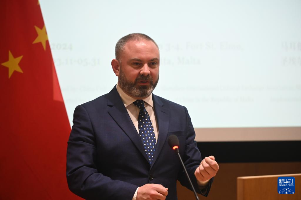 3月15日,在马耳他瓦莱塔,马耳他国家遗产、艺术和地方政府部长邦尼奇在马耳他艺术双年展中国馆开幕式上致辞。