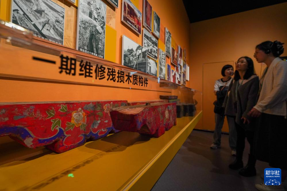 5月11日,观众在展出现场参观布达拉宫一期维修残损木质构件。