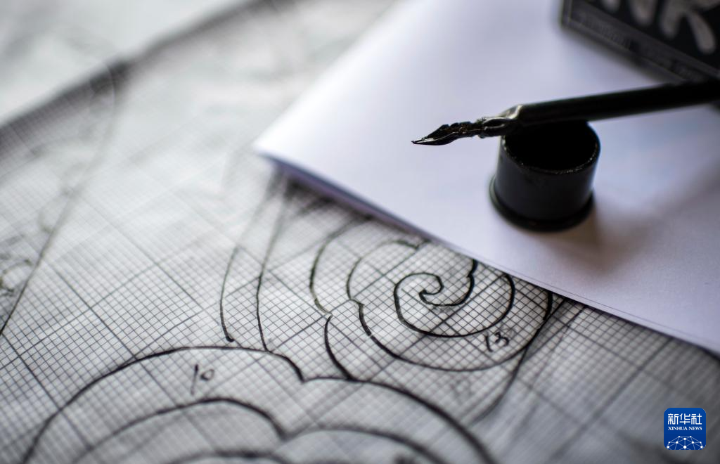 6月27日,在位于北京十里河的工作室,冀豫在描画宫毯设计图稿。