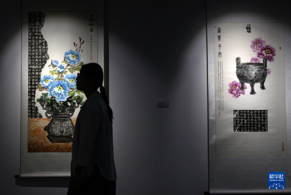 在洛阳华夏金石文化博物馆,钱夏玉在观看金石博古画成品(9月11日摄)。