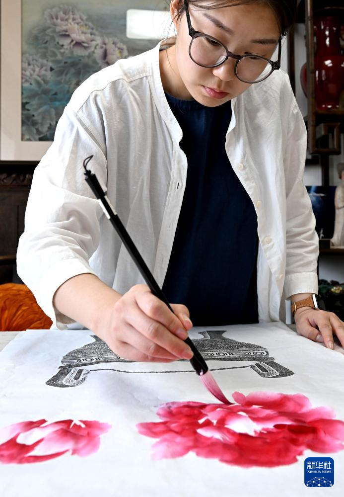 在洛阳华夏金石文化博物馆,钱夏玉在拓印完成的金石拓片上补绘牡丹画(9月11日摄)。
