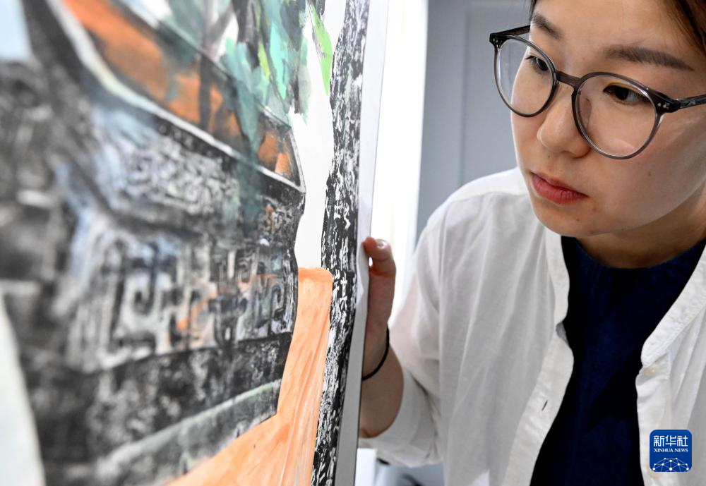 钱夏玉在洛阳龙门画院内扑墨(9月11日摄)。