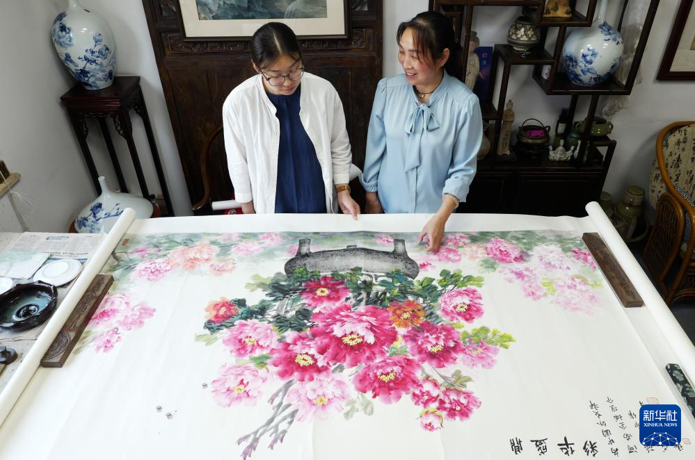 在洛阳龙门画院,钱夏玉与同事一同观看研究金石博古画成品(9月11日摄)。