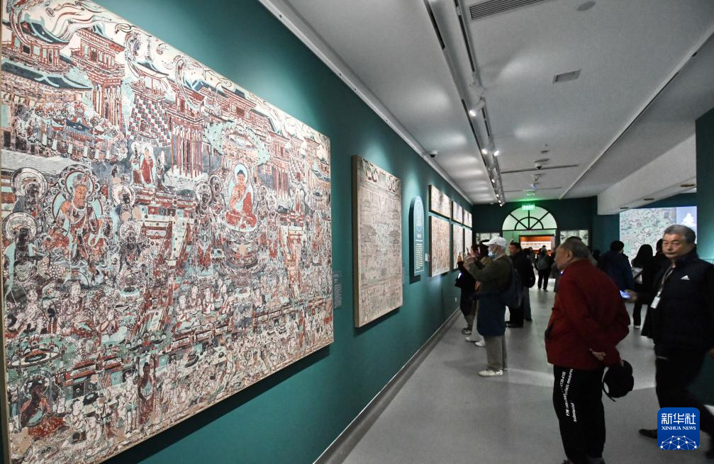 3月29日,观众在参观“如是莫高”敦煌艺术大展中展出的复刻壁画。