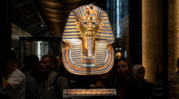 12月20日,游客在埃及吉萨的大埃及博物馆观赏法老图坦卡蒙的黄金内棺。