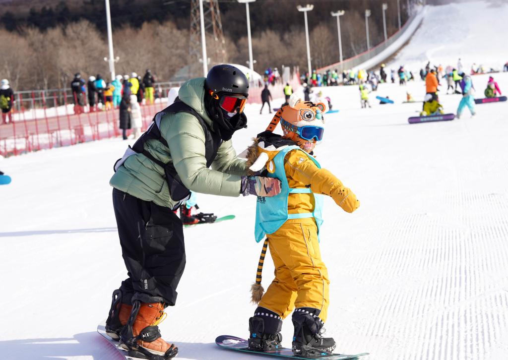 12月3日,吉林市中小学生在“冰雪假期”期间,在吉林市纳美山谷度假区体验单板滑雪。新华社记者 颜麟蕴 摄