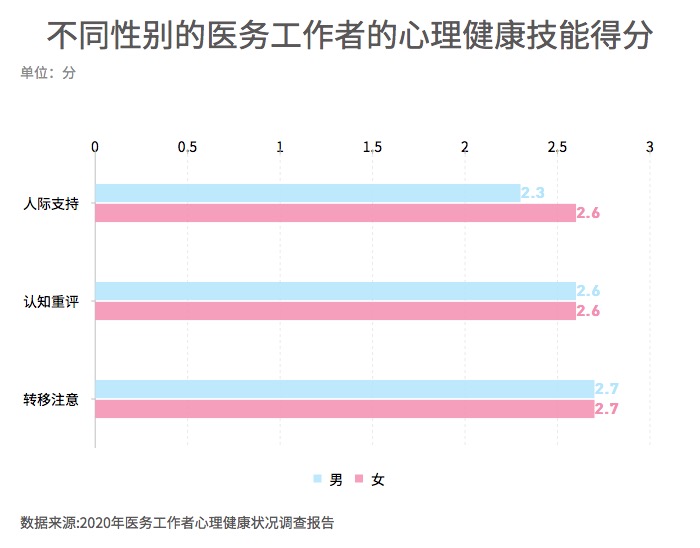 ????? 不同性別醫(yī)務(wù)工作者的心理健康技能得分在不同技能上差異不大, 男女兩性醫(yī)務(wù)工作者在認(rèn)知重評和轉(zhuǎn)移注意上的得分相同,只有在人際支持上存在差異。在人際支持上,男性醫(yī)務(wù)工作者的得分略低于女性醫(yī)務(wù)工作者。