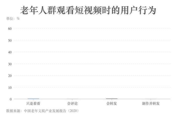 ???? ?總的來(lái)看,由于使用短視頻應(yīng)用的熟練程度、觀看短視頻的習(xí)慣等一些因素的影響,老年人群觀看短視頻的互動(dòng)較少,但較愛(ài)轉(zhuǎn)發(fā)。從所有年齡段的用戶(hù)互動(dòng)來(lái)看,82.8%的用戶(hù)有過(guò)不同形式的短視頻互動(dòng)。其中,63.8%的用戶(hù)會(huì)轉(zhuǎn)發(fā)分享,65.5%的用戶(hù)會(huì)點(diǎn)贊、評(píng)論、收藏,不參與互動(dòng)的用戶(hù)僅占13.2%。參與轉(zhuǎn)發(fā)分享的短視頻用戶(hù)當(dāng)中,20~39歲人群是主力軍,占比近60%,不參與互動(dòng)的多為40歲以上的用戶(hù)。來(lái)自60加研究院的統(tǒng)計(jì)結(jié)果顯示,在參與互動(dòng)的老年用戶(hù)中,會(huì)轉(zhuǎn)發(fā)的用戶(hù)占比達(dá)到53.8%,轉(zhuǎn)發(fā)是他們常有的互動(dòng)行為。