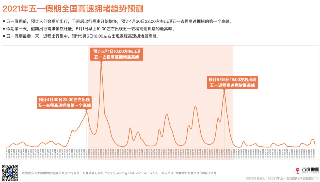 ????? 今年“五一”假期繼續(xù)延續(xù)“加長(zhǎng)版”,5天長(zhǎng)假點(diǎn)燃了眾多消費(fèi)者的出游熱情。根據(jù)中國(guó)旅游研究院的預(yù)測(cè),今年“五一”國(guó)內(nèi)旅游出游有望達(dá)到2.2億人次,按可比口徑甚至超過(guò)疫前同期水平。根據(jù)百度地圖《2021年五一假期出行預(yù)測(cè)報(bào)告》,近年來(lái)出行規(guī)模最大的“五一”黃金周將來(lái)臨。預(yù)計(jì)5月1日出現(xiàn)五一去程人口遷徙最高峰。