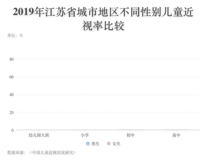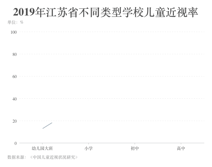 ????? 中國兒童近視率隨年齡的增長呈現(xiàn)上升趨勢。以江蘇省2019年的調(diào)查結(jié)果為例,該省幼兒園大班兒童近視率為12.8%,小學階段增長至38.5%,初中階段增長至80.2%,顯示出近視率在小學和初中階段增長速度較快,說明低年齡階段是近視防控的重點階段。
