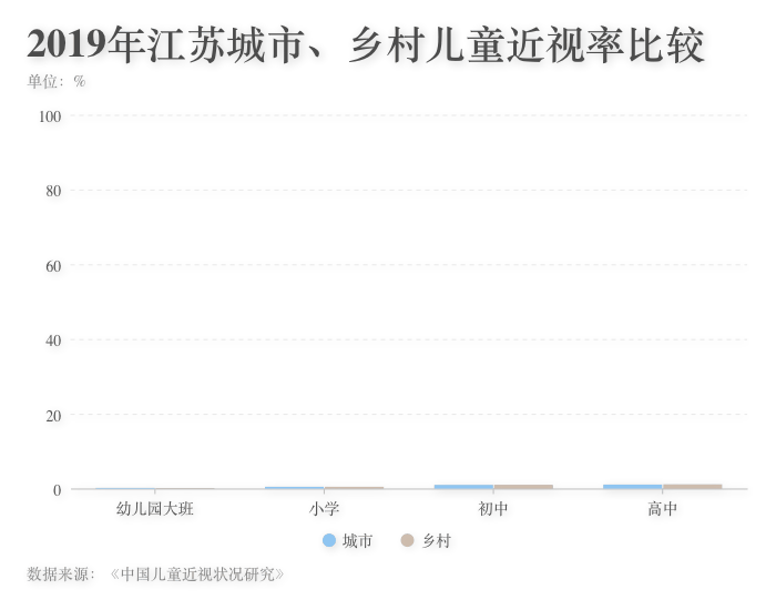 ????? 調(diào)查顯示,中國城市地區(qū)的兒童總體近視率約為48.8%,顯著高于鄉(xiāng)村地區(qū)兒童的近視率(31.9%)。但是在不同階段尤其在中學階段,有調(diào)查結(jié)果顯示鄉(xiāng)村兒童近視率反超城市兒童。以江蘇省為例,該地區(qū)幼兒園大班和小學階段城市兒童近視率高于鄉(xiāng)村兒童,初中和高中階段城市兒童近視率低于鄉(xiāng)村兒童,顯示出鄉(xiāng)村兒童在小學至初中階段近視增長率高于城市兒童,需要重點防控。