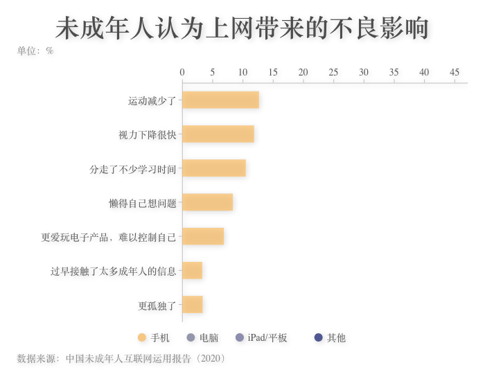 ????? 近年來,青少年使用電子產(chǎn)品機會和上網(wǎng)時間的增多,也直接導致了許多兒童身體素質(zhì)下降和視力損害。調(diào)查顯示,未成年人認為不同終端上網(wǎng)帶來的不良消息影響中,“視力下降很快”和“運動減少”這兩項占的比例最高。