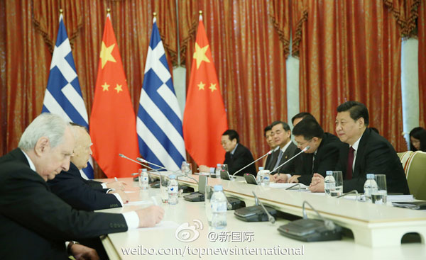 習(xí)近平7日在索契會(huì)見希臘總統(tǒng)帕普利亞斯 蘭紅光攝