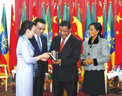 ▲李克強(qiáng)總理與夫人程虹當(dāng)?shù)貢r間6日上午同埃塞總統(tǒng)穆拉圖夫婦在國家宮會見。會見后,程虹將自己的著作和譯著贈送給姆拉圖總統(tǒng)夫婦。圖/中國政府網(wǎng)