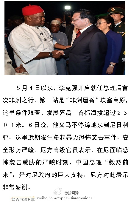 ????新華網(wǎng)北京5月7日電 據(jù)新華社“新國(guó)際”微博報(bào)道,5月4日,李克強(qiáng)開啟就任總理后首次非洲之行。繼首站訪問條件艱苦、發(fā)展落后的“非洲屋脊”埃塞高原后,6日晚,他又馬不停蹄地來到面臨恐怖襲擊威脅的尼日利亞。尼方高級(jí)官員表示,中國(guó)總理“毅然前來”,是對(duì)尼政府的巨大支持,尼方對(duì)此表示非常感謝。