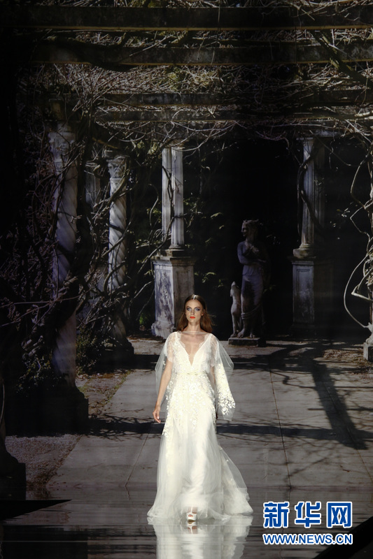 模特在T臺上展示西班牙品牌Yolan Cris的婚紗。Yolan Cris品牌由Yolanda和Cristina姐妹聯(lián)手打造,同時(shí)這也是來自巴塞羅那當(dāng)?shù)氐囊粋€婚紗品牌。