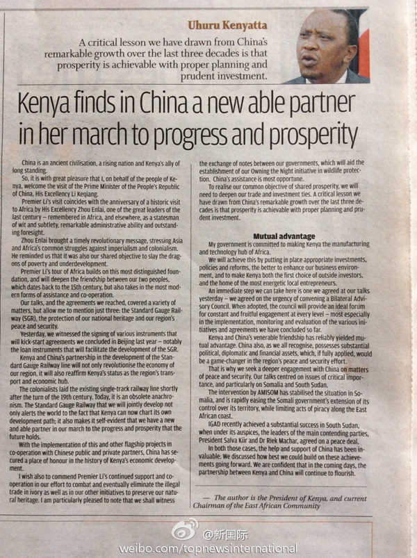 ????新華網(wǎng)北京5月11日電? 據(jù)新華社“新國際”微博報道,肯尼亞《旗幟報》11日發(fā)表肯雅塔總統(tǒng)署名文章《肯將中國視為發(fā)展繁榮進(jìn)程中的強(qiáng)力伙伴》。文章稱,李克強(qiáng)此訪將進(jìn)一步加深傳統(tǒng)友誼,推動雙方新時期合作。隨著多領(lǐng)域的良好合作,中國在肯經(jīng)濟(jì)社會發(fā)展中重要性與日俱增??戏綄现嘘P(guān)系未來充滿信心。