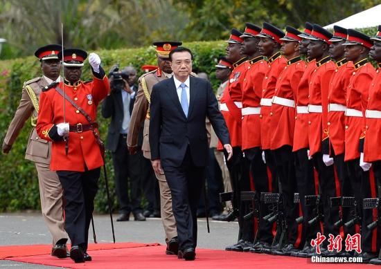 5月10日,中國國務(wù)院總理李克強(qiáng)在肯尼亞總統(tǒng)府廣場出席肯總統(tǒng)肯雅塔舉行的歡迎儀式。中新社發(fā) 劉震 攝