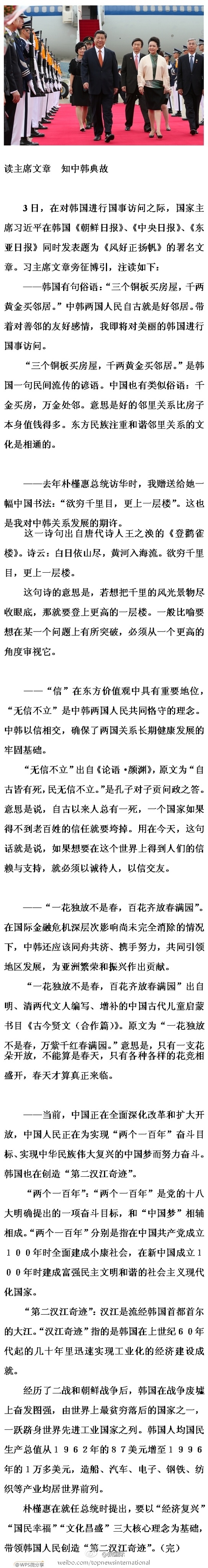 ????新華網(wǎng)北京7月4日電 據(jù)新華社“新國際”微博報道,3日,在對韓國進(jìn)行國事訪問之際,國家主席習(xí)近平在韓國《朝鮮日報》、《中央日報》、《東亞日報》同時發(fā)表題為《風(fēng)好正揚(yáng)帆》的署名文章。習(xí)主席文章旁征博引,注讀詳見長微博。