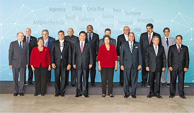 ? 當?shù)貢r間7月17日下午,中國—拉美和加勒比國家領(lǐng)導人會晤在巴西利亞舉行。本次會晤由中方倡議,中國國家主席習近平、巴西總統(tǒng)羅塞夫、哥斯達黎加總統(tǒng)索利斯、古巴國務(wù)委員會主席兼部長會議主席勞爾·卡斯特羅、厄瓜多爾總統(tǒng)科雷亞、蘇里南總統(tǒng)鮑特塞、哥倫比亞總統(tǒng)桑托斯、智利總統(tǒng)巴切萊特、圭亞那總統(tǒng)拉莫塔爾、烏拉圭總統(tǒng)穆???、委內(nèi)瑞拉總統(tǒng)馬杜羅、安提瓜和巴布達總理布朗等出席。